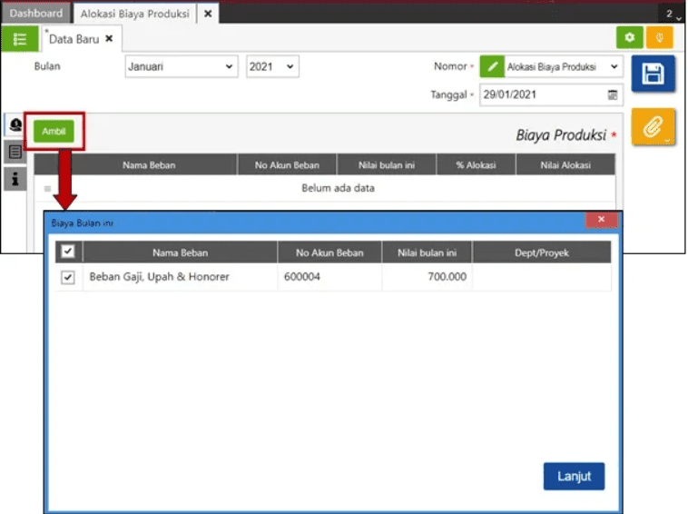 4. Kemudian klik ‘Ambil’ dan pilih biaya produksi yang dimaksud (catatan : nilai biaya akan tampil jika digunakan dalam proses produksi di periode tanggal alokasi biaya produksi tersebut). Lalu klik ‘Lanjut’.