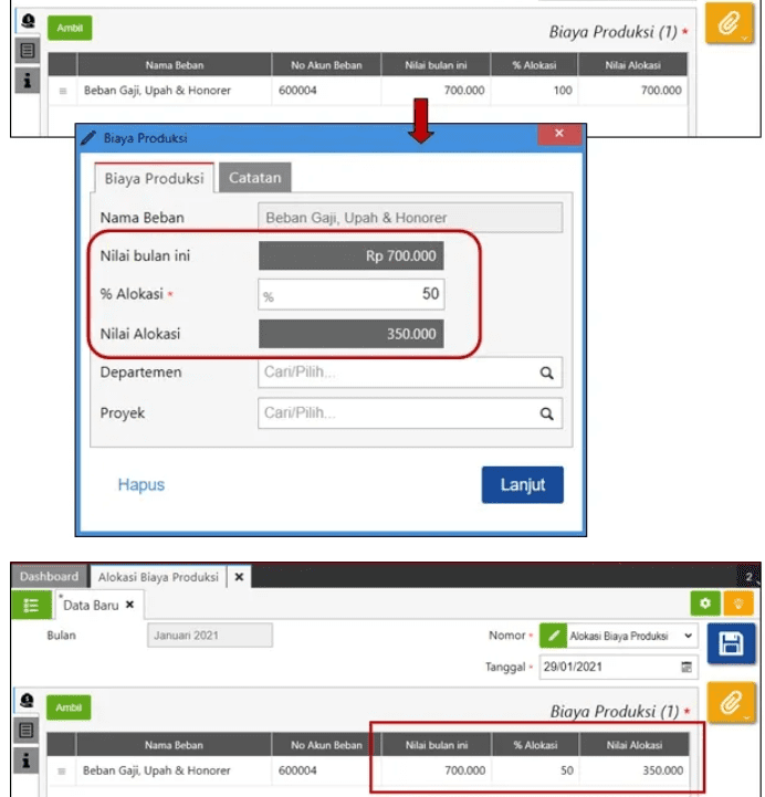 Merupakan fitur untuk mengalokasikan biaya-biaya yang dikeluarkan dalam proses produksi ke dalam harga pokok produksi atas produk diproduksi tersebut. Proses alokasi biaya ke harga pokok produksi, baru bisa dilakukan setelah anda melakukan pencatatan pengeluaran atas biaya tersebut.