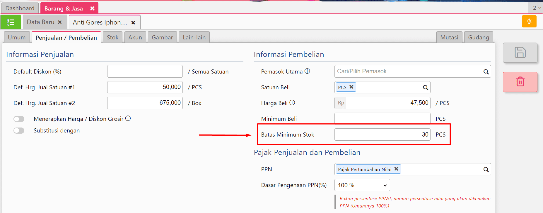 4. Selanjutnya klik tab Penjualan/Pembelian, ubah pada Barang Stok Minimum lalu klik Simpan.