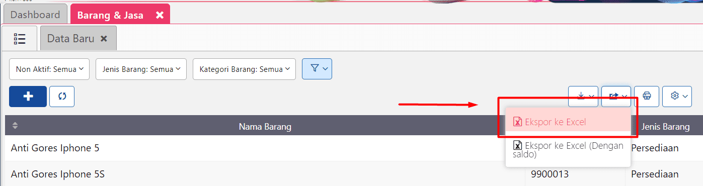 3. Klik menu Daftar Barang & Jasa (warna hijau), kemudiaan klik Eksport lalu pilih ‘Eksport to Excel’.