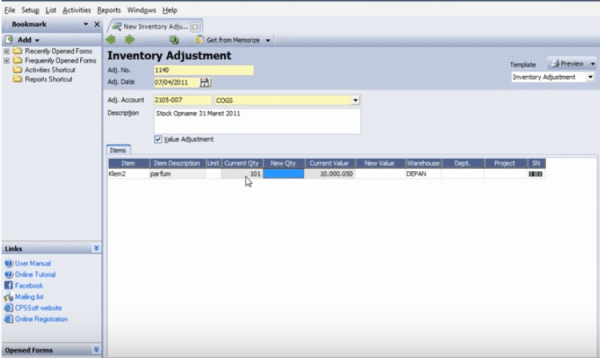 Inventory Adjustment merupakan fitur yang di sediakan software Accurate untuk stok opname, apabila sudah melakukan stok opname dan terjadi selisih stok antara gudang dan pencatatan di accurate maka Anda dapat melakukan inventory adjustment untuk menambah stok item, berikut ini langkah-langkah cara penginputannya :