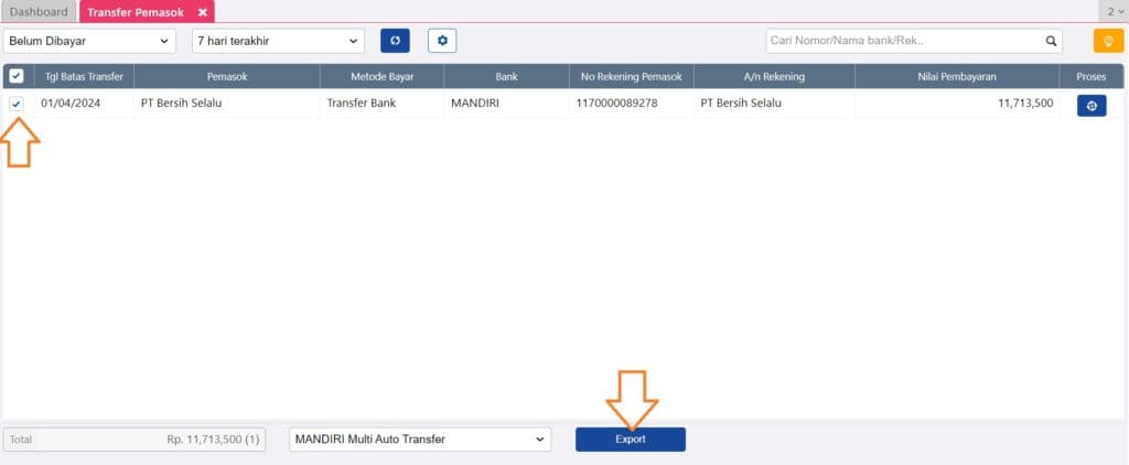 3. Pilih Periode transaksi, klik icon Perbarui dan centang transaksi yang akan melakukan transfer pemasok.