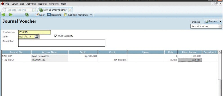 3. Ketika kita membuka report All Jurnal, tampilan default-nya akan menggunakan mata uang default currency yaitu Rp 100.000