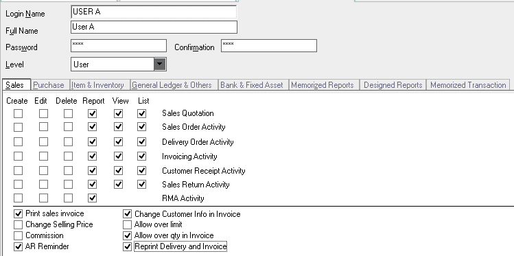 Contoh : setting Profil di accurate client A mengakses fitur Sales di ACCURATE hanya bisa melihat seperti Report, View dan List maka siuser tersebut tidak bisa menggunakan Fitur seperti Create, Edit dan Delete di Modul Sales.